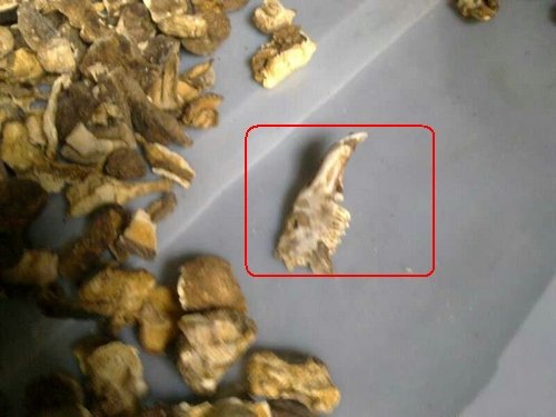 工作人员在剩余的香菇中发现老鼠的下颚头骨。 戴玮/摄(图片转自:温州网)