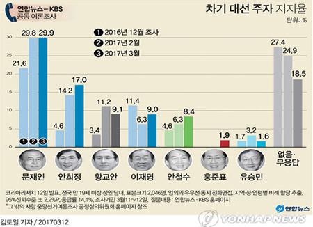 在共同民主党候选人中,文在寅支持率最高,达34.5%,然后是安熙正,支持率达33.3%,两位候选人势均力敌。在除共同民主党和自由韩国党之外的第三地带候选人中,安哲秀支持率最高,达26.9%。