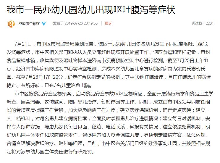 截至7月25日上午11点,经济南市疾病预防控制中心实验室检测,造成本次幼儿园儿童发病的致病菌为宋内氏志贺氏菌。截至7月26日17时20分,确定符合病例定义的46例,其中10例住院治疗,目前住院患儿的病情稳定、有所好转,已有3名儿童治愈出院。目前,济南市市中区有关部门已经约谈涉事幼儿园,并按照相关规定将对涉事幼儿园主体责任进行行政处罚。(央视记者 张明)