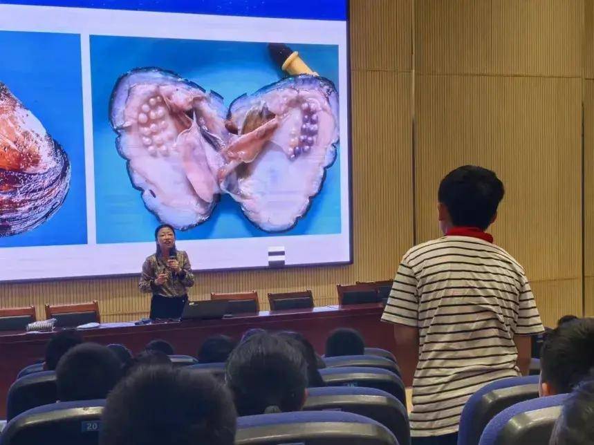 杜博士从珍珠的形成机理、人工育珠技术和培育方式、珍珠贝外部形态和内部结构、养殖流程以及珍珠贝的经济和生态学价值等多方面讲解了有关知识,现场同学们积极参与互动问答。