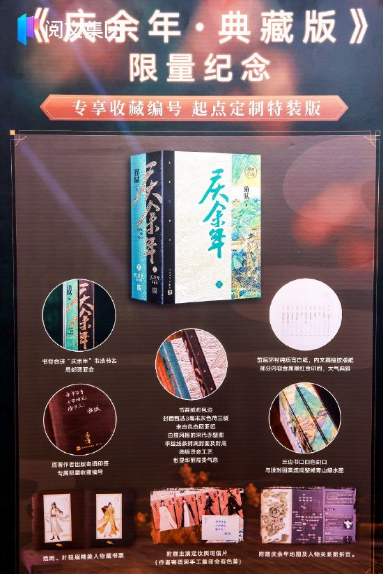 此次书展,由阅文独家定制的《庆余年典藏版》限量纪念套装正式首发(人民文学出版社出版)。书籍设计工艺精美,配有作者出版寄语印签、专属限量收藏编号,同时附赠精美人物藏书票、电视剧主演明信片、庆余年地图折页,以及起点读书App、腾讯动漫App线上用户权益。据了解,《庆余年第二季》播出后,起点读书的原著阅读量提升了38倍。IP影视化再次带动了原著的火爆。