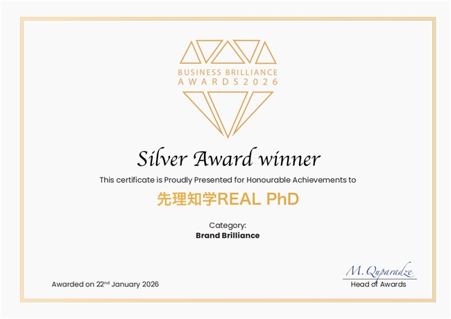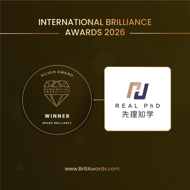 近日,一站式海外博士申请品牌先理知学REAL PhD(简称“先知”)获得了来自International Brilliance Awards的权威认证:在Business Brilliance Awards 2026中荣获Brand Brilliance Silver Award,并收获评审委员会“This is a brand that does things the right way. Strong academic standards, clear values, and a real sense of care for the people it serves.”(“先理知学REAL PhD,坚守专业高度,践行清晰价值观,以真诚关怀托举每一位学子申博梦”)的高度评价。这一奖项体系旨在嘉奖对全球品牌领域产生卓越影响力的机构。