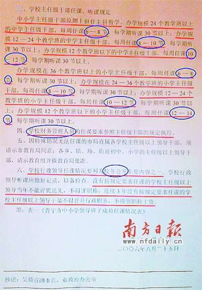 此外,该校领导干部常年存在“逃课”的情况。根据普宁市教育局2006年8月发布的《普宁市中小学校中层以上领导干部任课、听课有关规定的通知》的规定(如右图,网络图片),“办学规模在12-24个教学班的中学正副校长每周任课4-6节,主任级干部每周任课8-10节,财务管理人员的任课要求参照主任级干部的规定执行”。