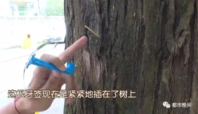 牙签能插进树皮,这威力可不小,随后记者更换测试对象再次尝试。