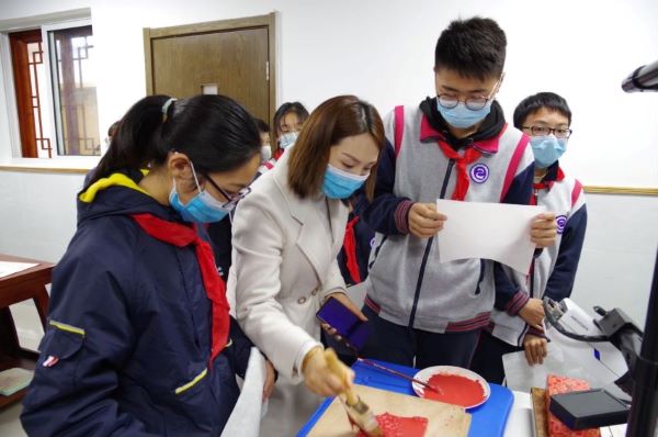 在“古籍装帧”展示区,非遗传播人、上海市博物馆图书馆副研究员陈宁给同学们介绍《古籍修复》非遗项目,现场教学带领同学们制作一本“蝴蝶装”古籍,让学生近距离体验、感受这项非物质文化遗产的独特魅力和文化内涵。此外,航拍中国、云游历史古城、英语剧本赏析、VR体验……各色活动为学生提供不同的“视听体验”。
