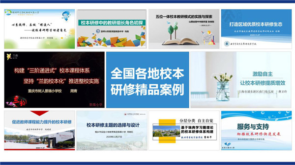校本研修以学校为基地,一切研修活动基于学校的实际开展。不同地域、不同学校的校本研修各有千秋。本次培训还邀请了山西、北京、重庆、上海、南京等地校本研修先进校相关领导分享本校特色的校本研修活动:《山西晋中五位一体校本教研模式的探索与研究》、《北京海淀区打造区域优质校本研修生态》、《重庆树人景瑞小学构建“三阶递进式”校本课程体系,坚持“兰韵校本化”推进整校实施》、《上海南门幼儿园--激励自主,让校本研修提质增效》、《南京科利华中学--促进教师课程力提升的校本研修》。同时也汇聚了《校本研修主题的选择与设计》、《基于学习圈理论的校本研修策划与实施--杭州市景成实验学校》、《助推校本研修快速发展--舟山市普陀区沈家门第四小学》等浙江本省的校本研修精品案例分享。