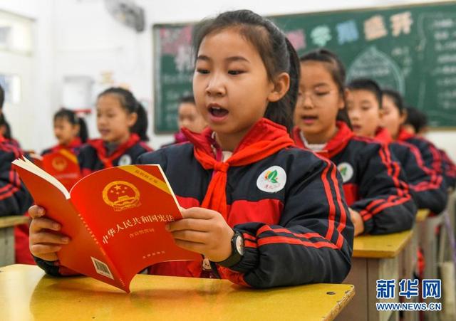 12月3日,扬州市邗江实验学校新盛分校的学生在诵读宪法。 在第七个“国家宪法日”即将来临之际,各地学校开展宪法知识宣传活动,通过宪法诵读、宪法知识小课堂等形式,对学生进行宪法教育。