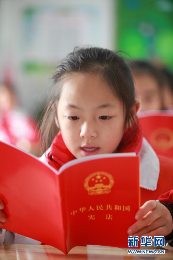 12月3日,河北唐山遵化市第二实验小学学生在诵读宪法。 在第七个“国家宪法日”即将来临之际,各地学校开展宪法知识宣传活动,通过宪法诵读、宪法知识小课堂等形式,对学生进行宪法教育。